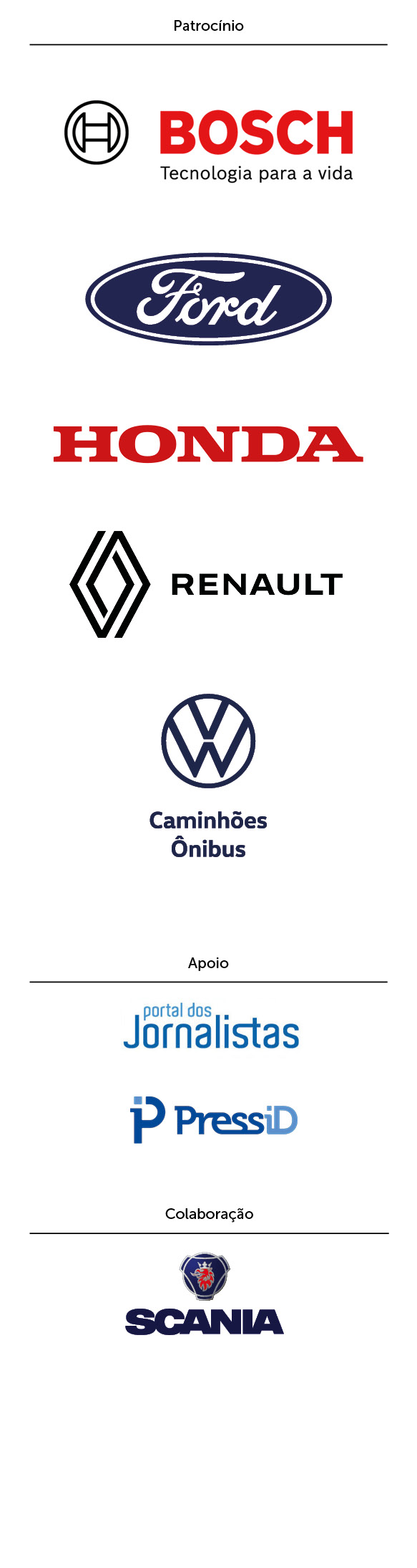 Áudio (Programa de Rádio/Podcast); Site; Períodico (Impresso/Digital); Video (Programa de TV/Canal de Youtube/VideoCast); Colunistas; Jornalista Especializado em Duas Rodas; Jornalistas Especializado em Veículos Comerciais; Jornalista Geral